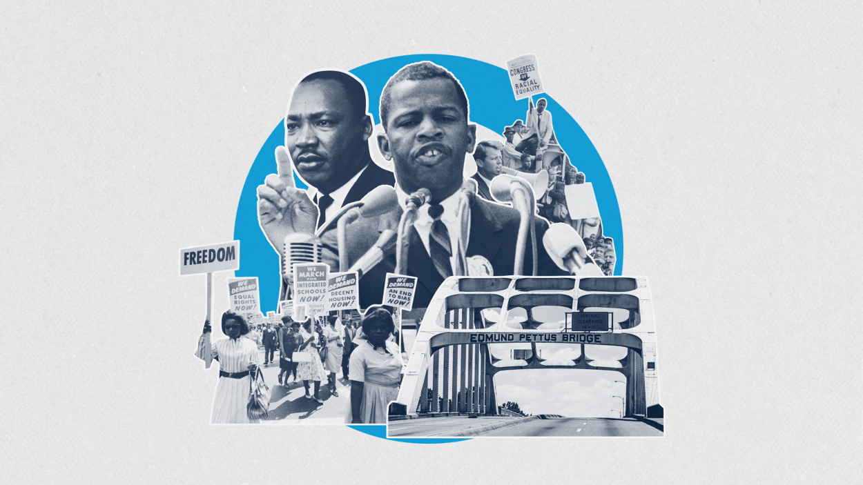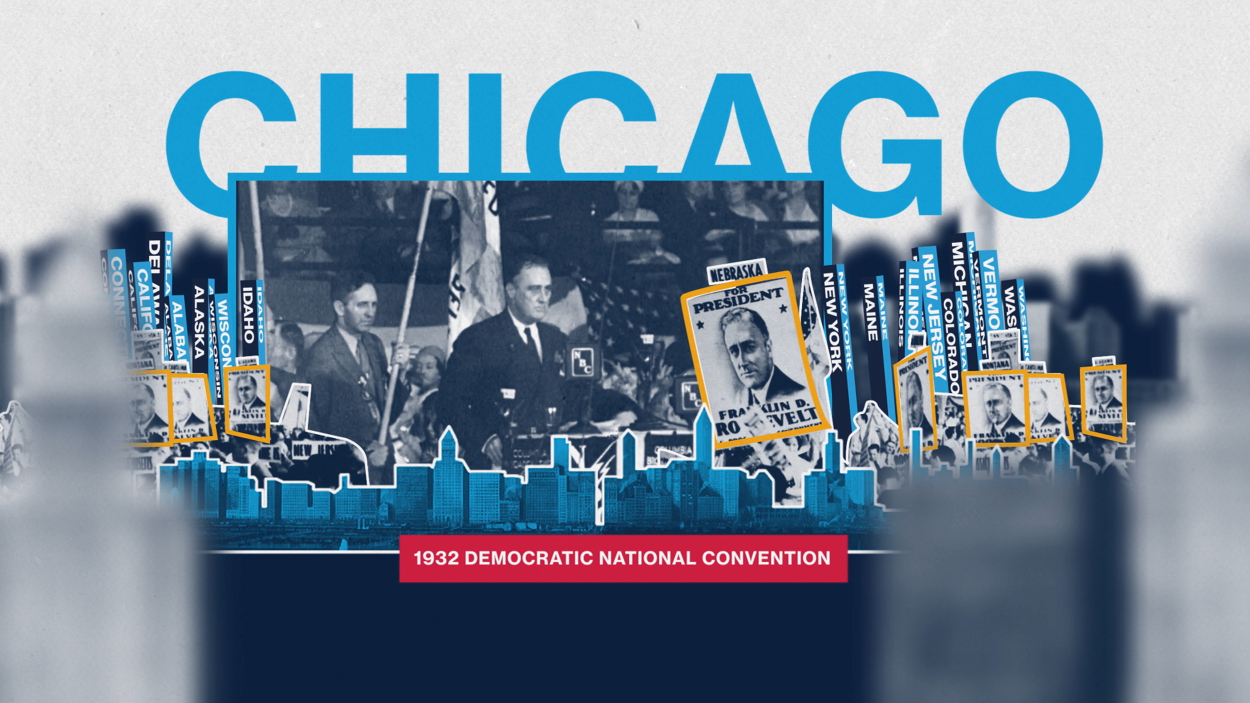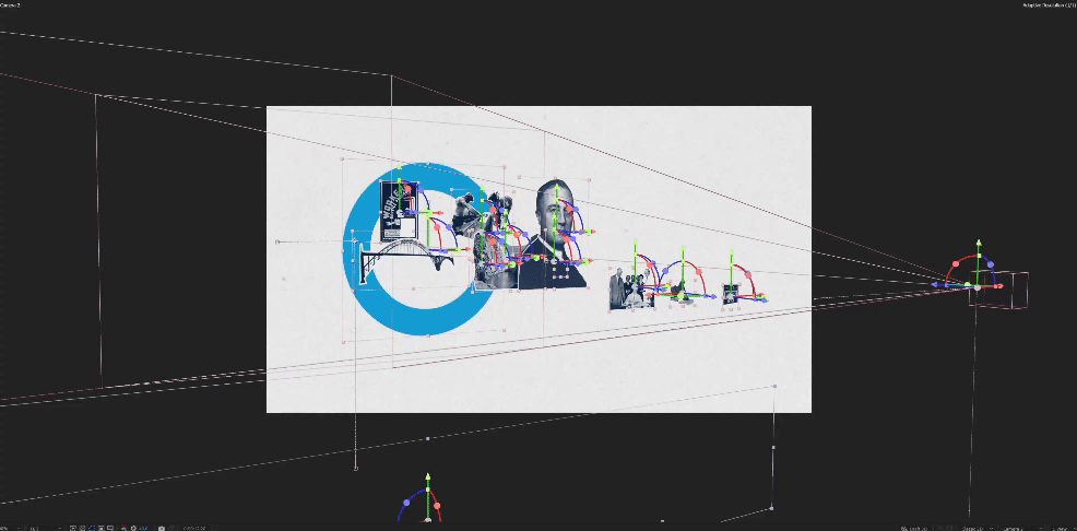 Our goal was to travel through the decades and highlight Democratic National Conventions throughout history, without being tied to a linear left-to-right timeline. To do that we utilized 3D space to create depth in our scenes, but also to give freedom to the camera to travel through history in more of an abstract manner.